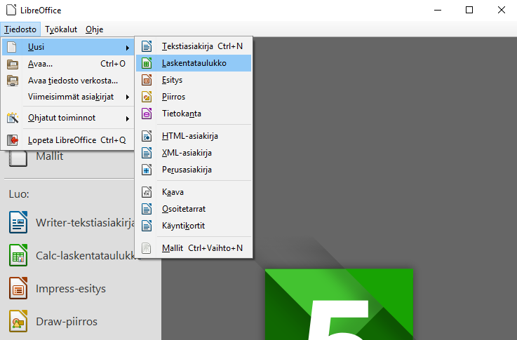 Valitse Tiedosto -> Uusi -> Tekstiasiakirja TAI Luo: Calc-laskentataulukko