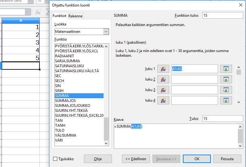 Laskuissa voidaan käyttää valmiita funktioita.