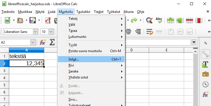 Solun määritteitä muokataan valitsemalla Muotoilu -> Solut.