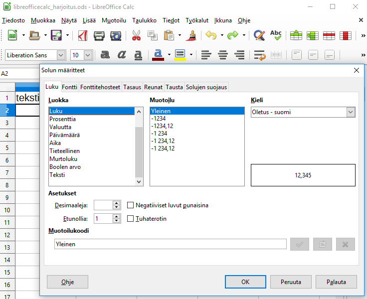 Numeroita sisältävä solu määritellään lukusoluksi, joka tasataan oikealle. Desimaalierottimena suomenkielisillä asetuksilla on desimaalipilkku.