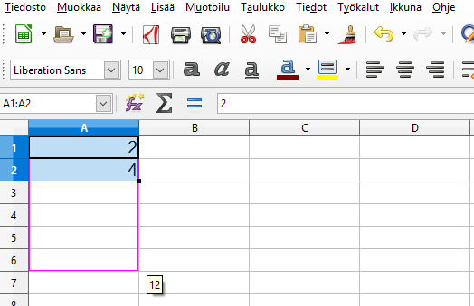 Lukusarjoja voi luoda automaattisesti. Kaksi ensimmäistä arvoa kirjoitetaan peräkkäisiin soluihin. Solut maalataan ja täyttökahvasta vedetään sarja halutun pituiseksi.