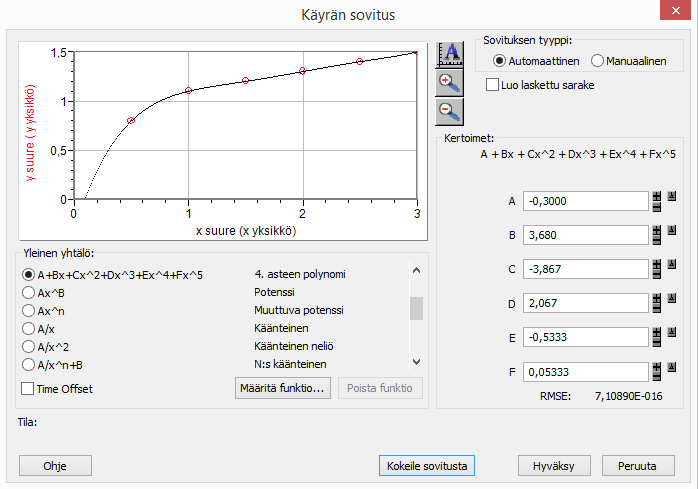 Listasta valitaan funktio ja kokeillaan sovitusta painamalla Kokeile sovitusta